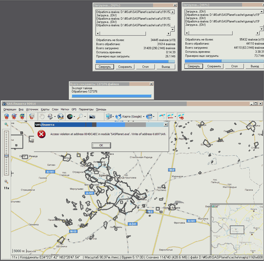 сначала окно экспорта не закрывалось, потом через несколько тыков, ctrl-f4, alt-f4 выскочил AV. закачка не прервалась.
