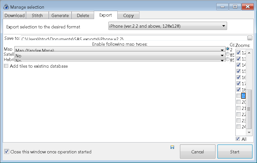 а именно: выбираем формат экспорта мобильные яндекс карты 3 , выбираем масштабы , те что делали, от 7 до 18 и выбираем типы карт: карту, спутник и присоединяем гибрид, выбираем путь для сохранения вашего творчества себе в комп :P