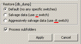 1. Создаёт дамп данных из повреждённых файлов (пытается прочитать неповреждённые данные). При создании дампа используется утилита db_dump. Файл дампа имеет несколько бОльший размер, чем исходный файл *.sdb (примерно в 1,5-2 раза).