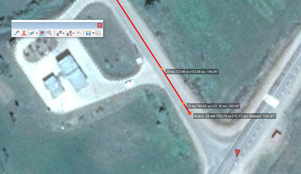 построил путь вдоль дороги, на яндекс.спутнике длина пути получается - 28,786км, на гугл.спутнике - 28,750км.