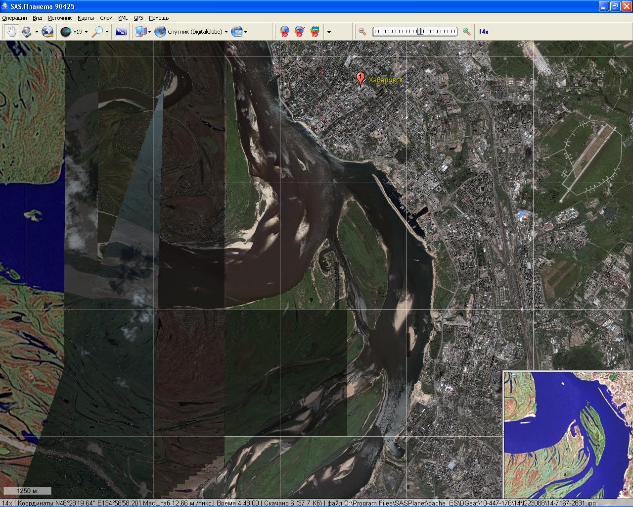 DigitalGlobe - N 48°28`48.87``, E 135°4`18.85``) ставишь максимум зума, 24х, и прав.кн.мыши - "загрузить тайл осн. карты". Ничего нет? Уменьшил и снова. Появилось? Уменьши и проверь, явно ли меняется картинка при переходе на соседних зумах (20, 21, 22 - это цифровой зум из 19 х и толку от него нет).