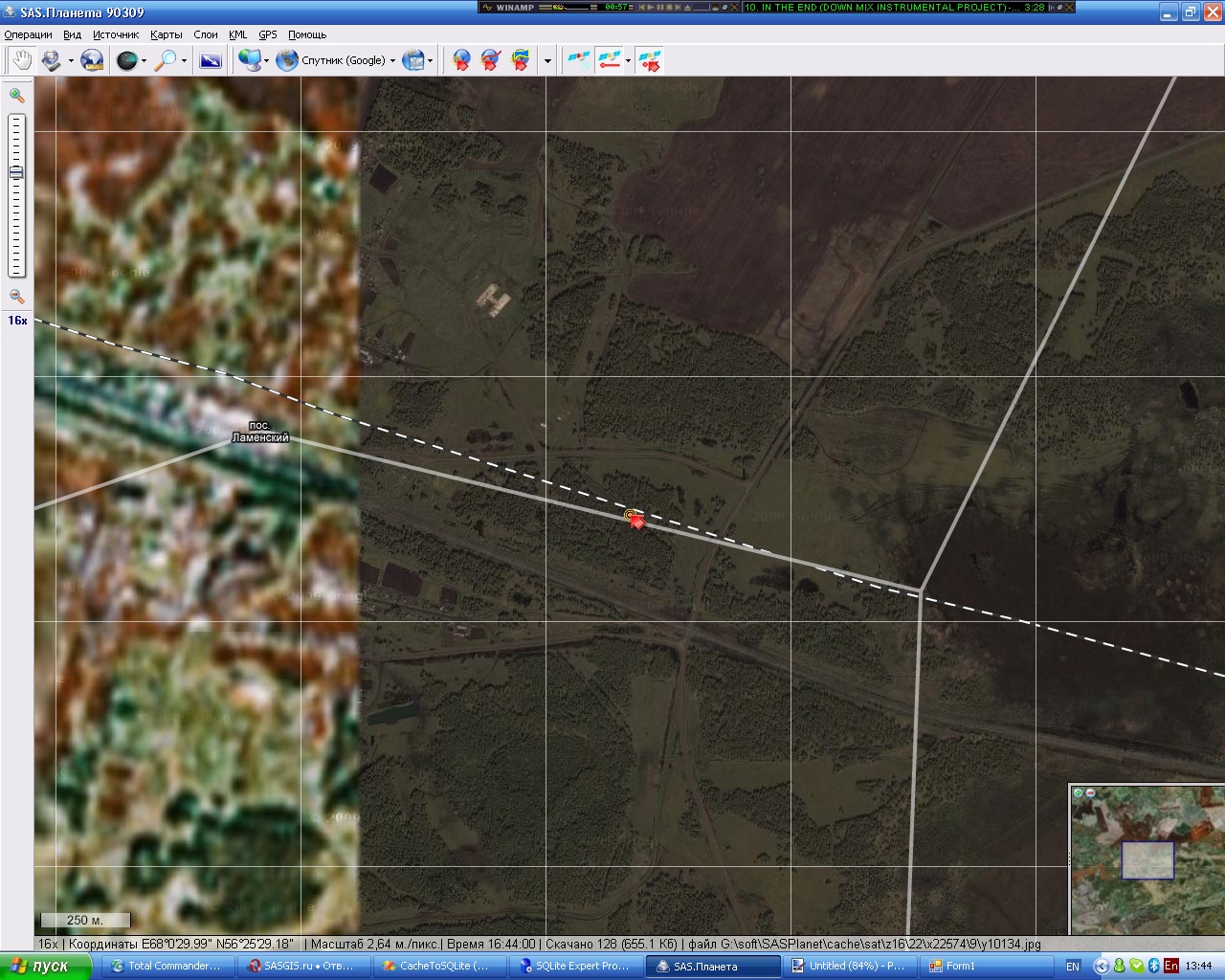 я увидел, что SAS Планета и ГуглMV для этого тайла дают координаты соответственно x=11287 y=5067, а веб-интерфейс x=45189 y=20256 (при одном увеличении, хоть оно на координаты и не должно влиять). Как видно, координаты "и не рядом". А поскольку еще позавчера все работало, я и делаю вывод, что что-то в гугле поменялось в алгоритме расчета координат тайлов. Если же нет, то у Вас и у всех остальных гугл должен работать корректно (я имею в виду из SAS Планеты). Попробуйте ради примера посмотреть место по приведенным мною градусам через SAS Планету примерно в 16 разрешении, если заработает - то проблемы у меня, но я с другого компьютера пробовал (другой провайдер) - яндекс и прочее работает а гугл нет. Также я скачал последнюю версию SAS Планеты (от 7 марта вроде) - не помогло.