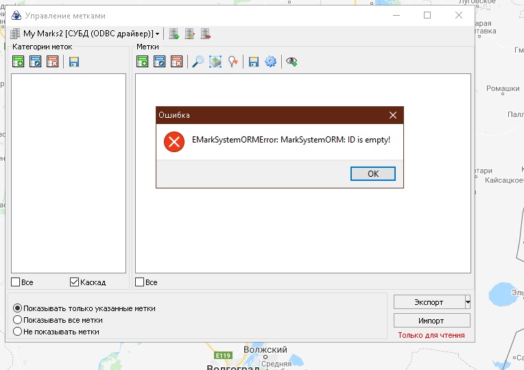 4) нажимаю кнопку применить (Apply) - SAS заполняет БД новыми пустыми табличками но выдает ошибку "EMarkSystemORMEerror:MarkSystem:ID is empty!"