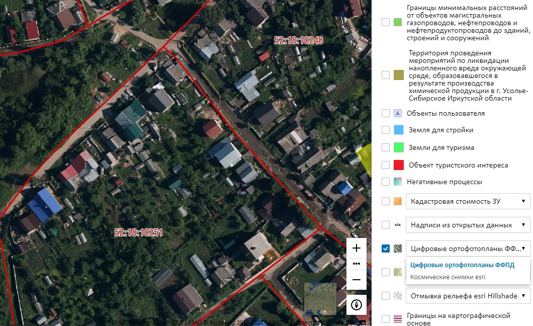 Имеется смысл подумать над добавлением карты - Ортофотопланы Росреестра, которые детально раскрываются на публичной кадастровой карте, например вот по этой ссылке: https://pkk.rosreestr.ru/#/search/65.64 ... ah2svt5i1d