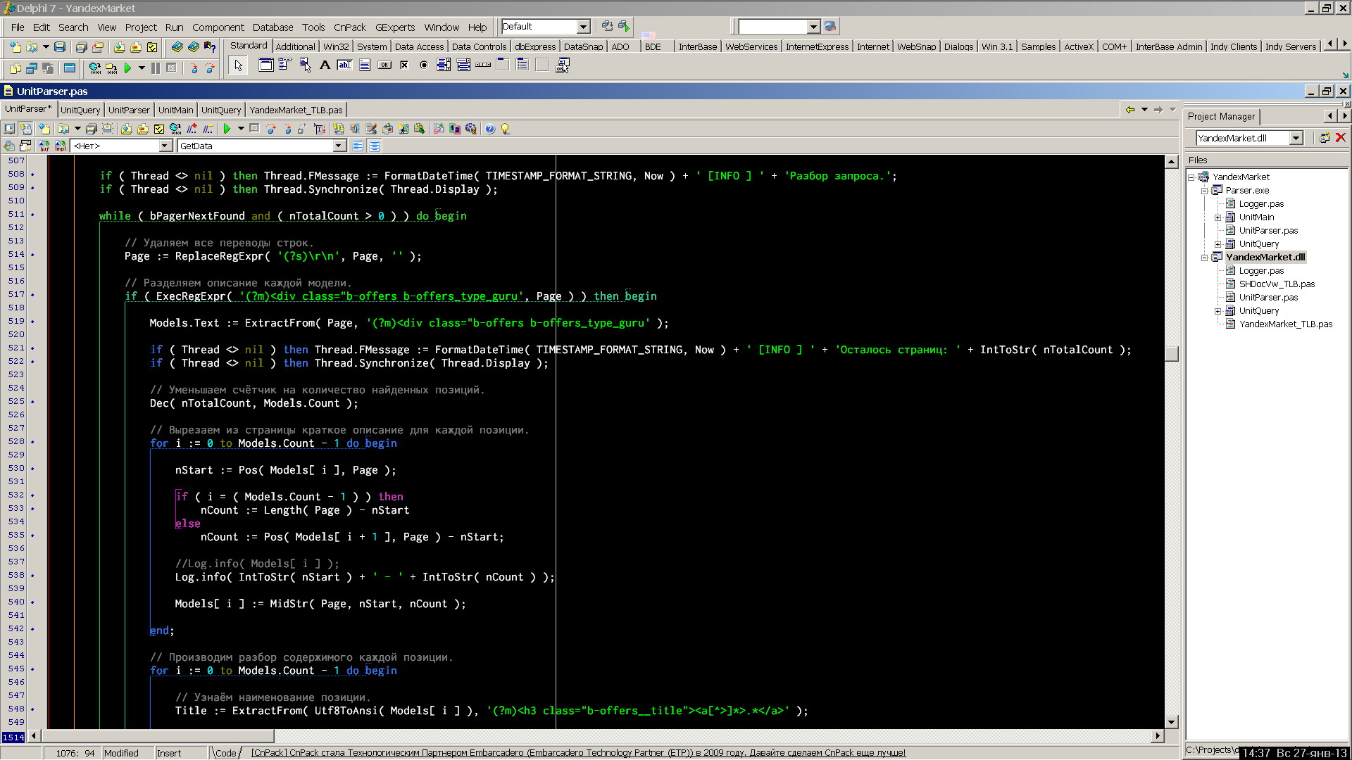 команды RSDN. Просто всё так в кучу напихано, что такое чувство, что писалось на мониторе с маленькой диагональю и код не помещался на экран. Я то сам привык пользоваться Code Formatter'ом, который был с GExperts, но в RS2007 что-то не понял как его подключить. Это влияет на скорочтение кода. Тут явно кому-то нужно почитать "Совершенный код" Макконнелла (там есть некоторые простые советы, которые можно было бы использовать, самый простой совет, который очевидно не выполняется в коде: расположение декларации переменных в секции var в порядке их сложности, например: boolean, WORD, integer, string, TObject, ...) или купить монитор с большей диагональю, чтобы не было дискомфорта при чтении более разряженного кода. Это не упрёк, а пожелание.
