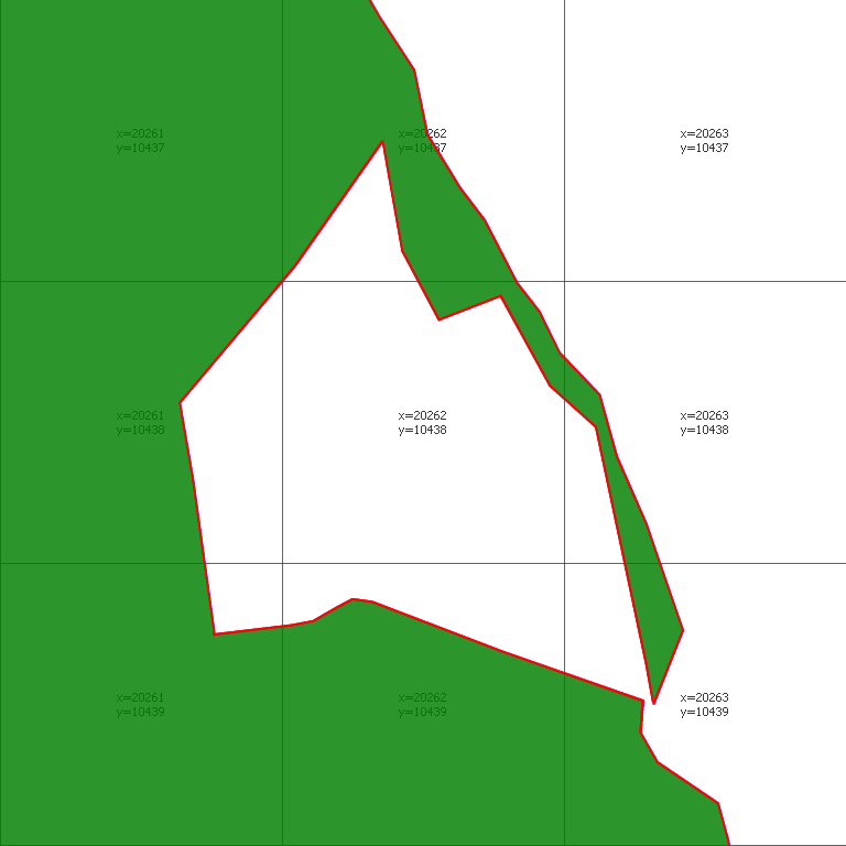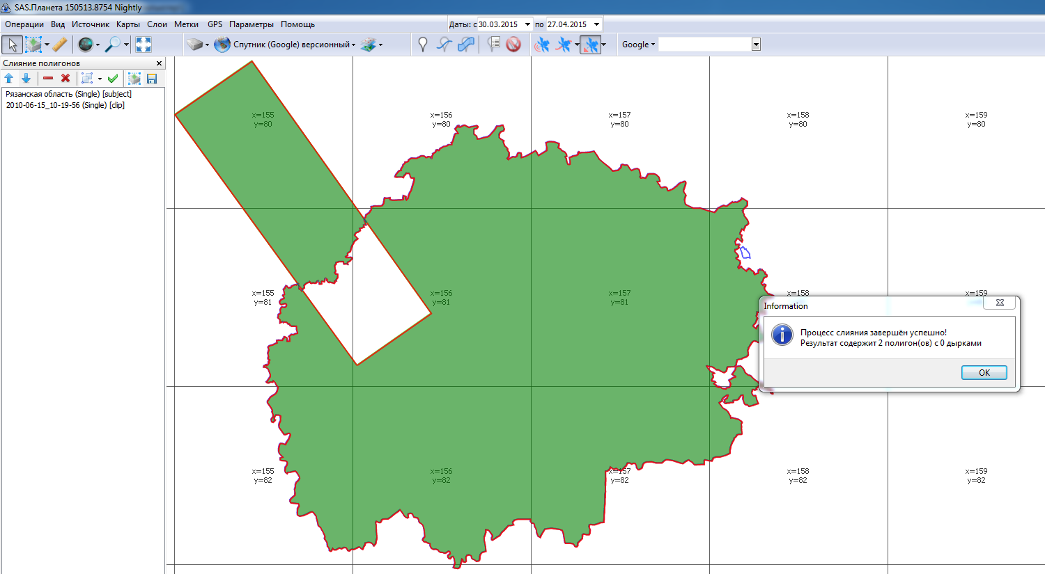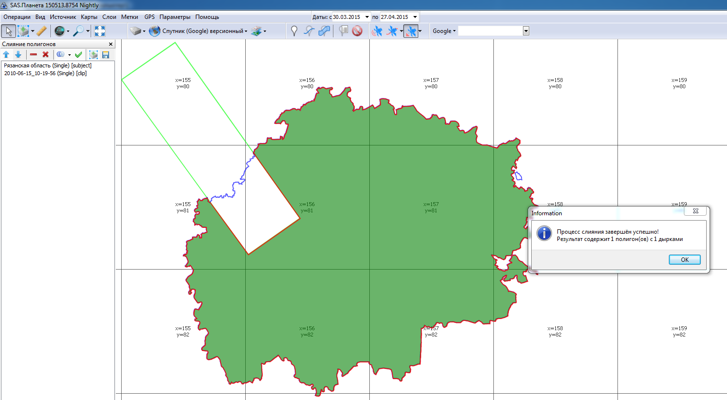 Впрочем, раз определение дырки чёткое, дырка обязана обнаруживаться визуально. Мне стало интересно, увеличил картинку и стал рассматривать места пересечения полигонов. Да, из-за весьма причудливой формы границы Рязанской области прямоугольник пересекает эту границу трижды в обоих случаях, вот откуда две дырки. Но есть ещё одна. И она образуется не при слиянии полигонов. Я пробовал слить границу области с простым четырёхугольником, явно пересекающем её в двух точках, там не может образоваться дырка. Но одна всё равно получалась. Поскольку полигон нельзя слить с самим собой, пришлось тупо обходить границу в поисках. И я её нашёл. Так что всё правильно с дырками.