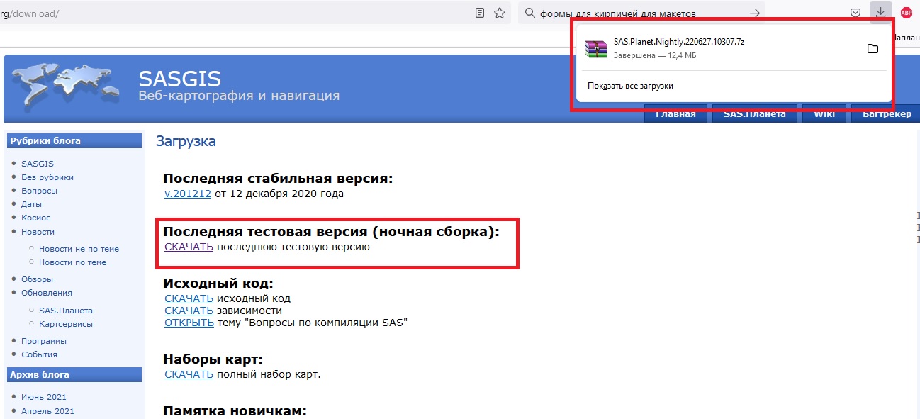 Со страницы загрузки sasgis.org/download/ ссылка на SAS.Planet.Nightly.220627.10307.7z - не работает