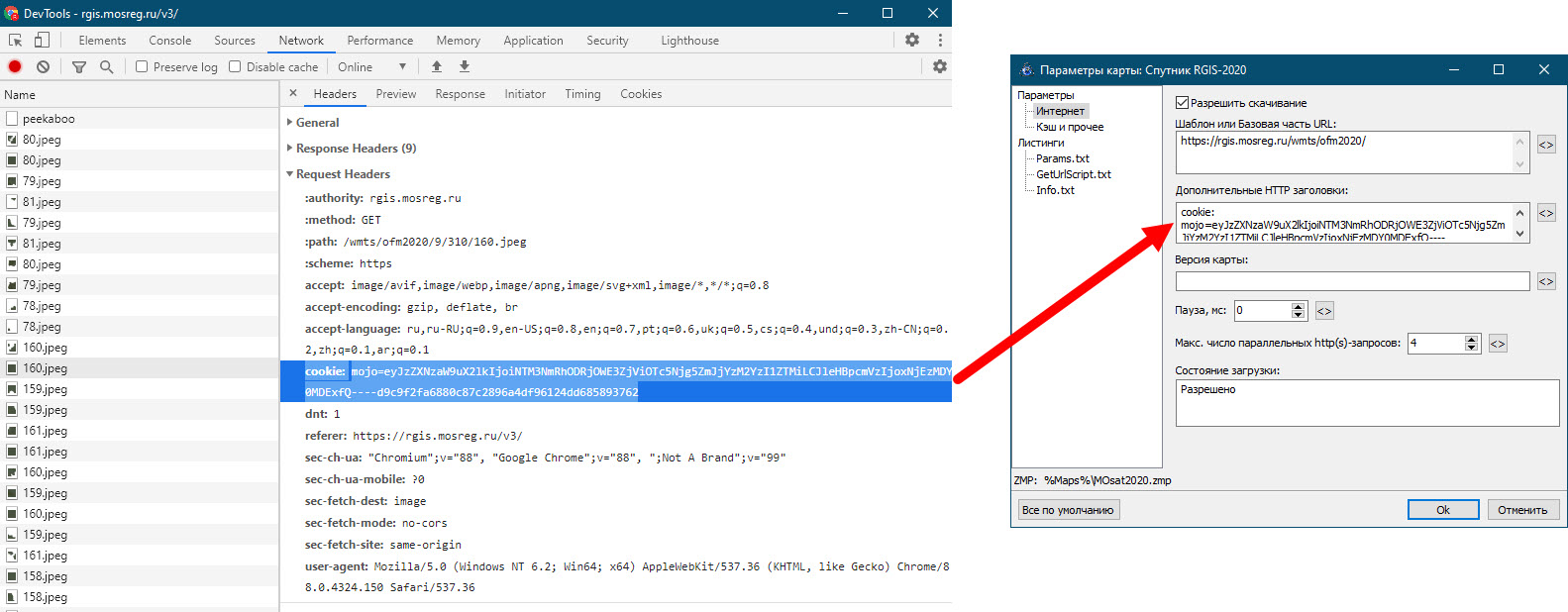 1. сначала запускаем RGIS карту в веб браузере, через средства разработчика браузера копируем у тайла всю строчку cookie в Запросе включая само слово "cookie:"