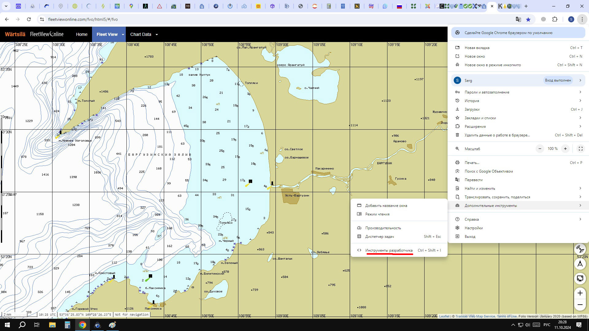 1. Заходим на сайт FleetviewOnline, заходим в Меню браузера "Настройки и управление", находим "Дополнительные инструменты", выбираем опцию "Инструменты разработчика" -