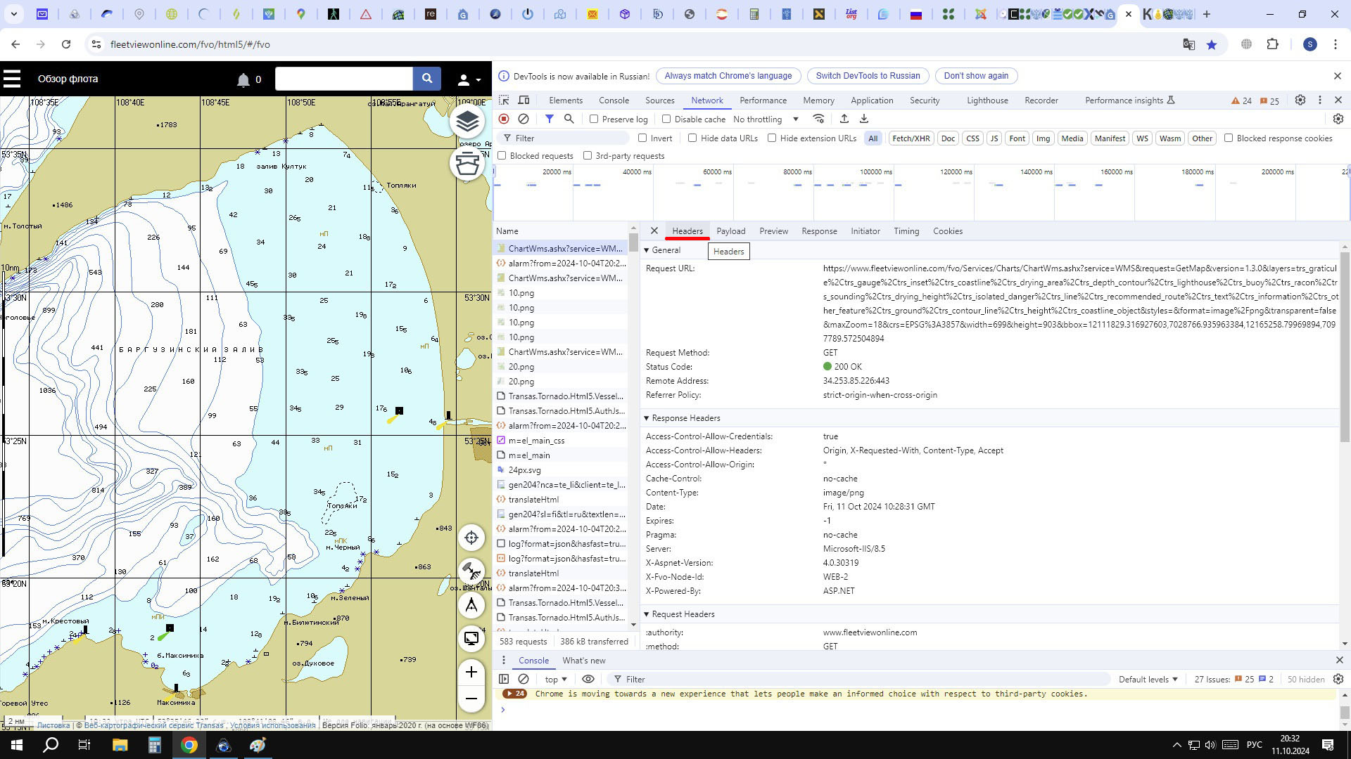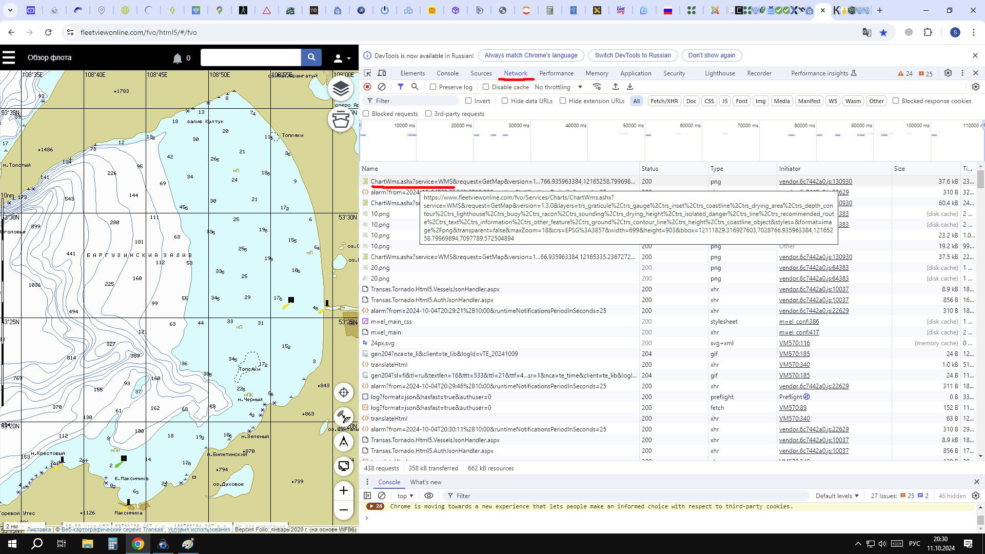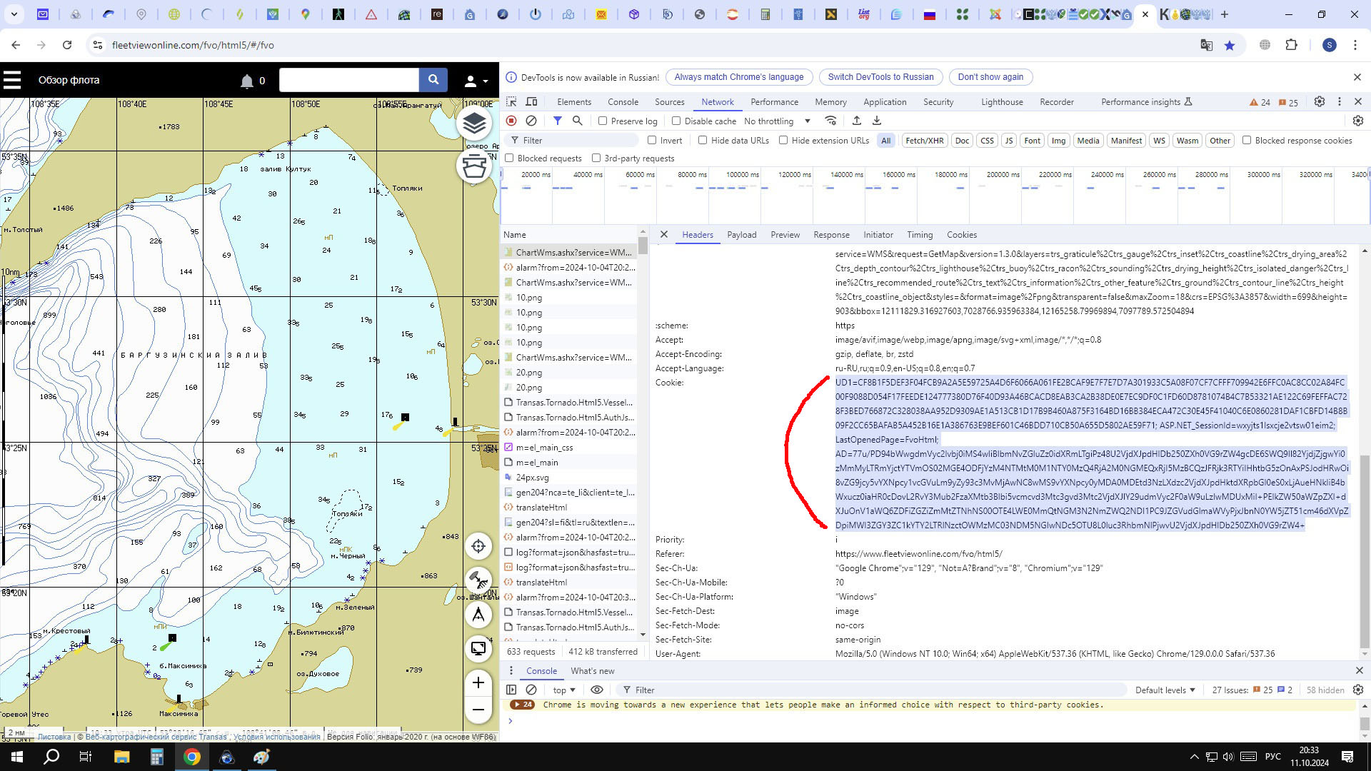 8. Опять идем на сайт, теперь надо сдвинуть изображение карты, чтоб пошло обновление файлов - новые появятся снизу в столбце "Name", опять находим среди них ChartWms.ashx?service=WMS.... и дальше повторяем действия с пункта 3. - цепляем свежий Cookie