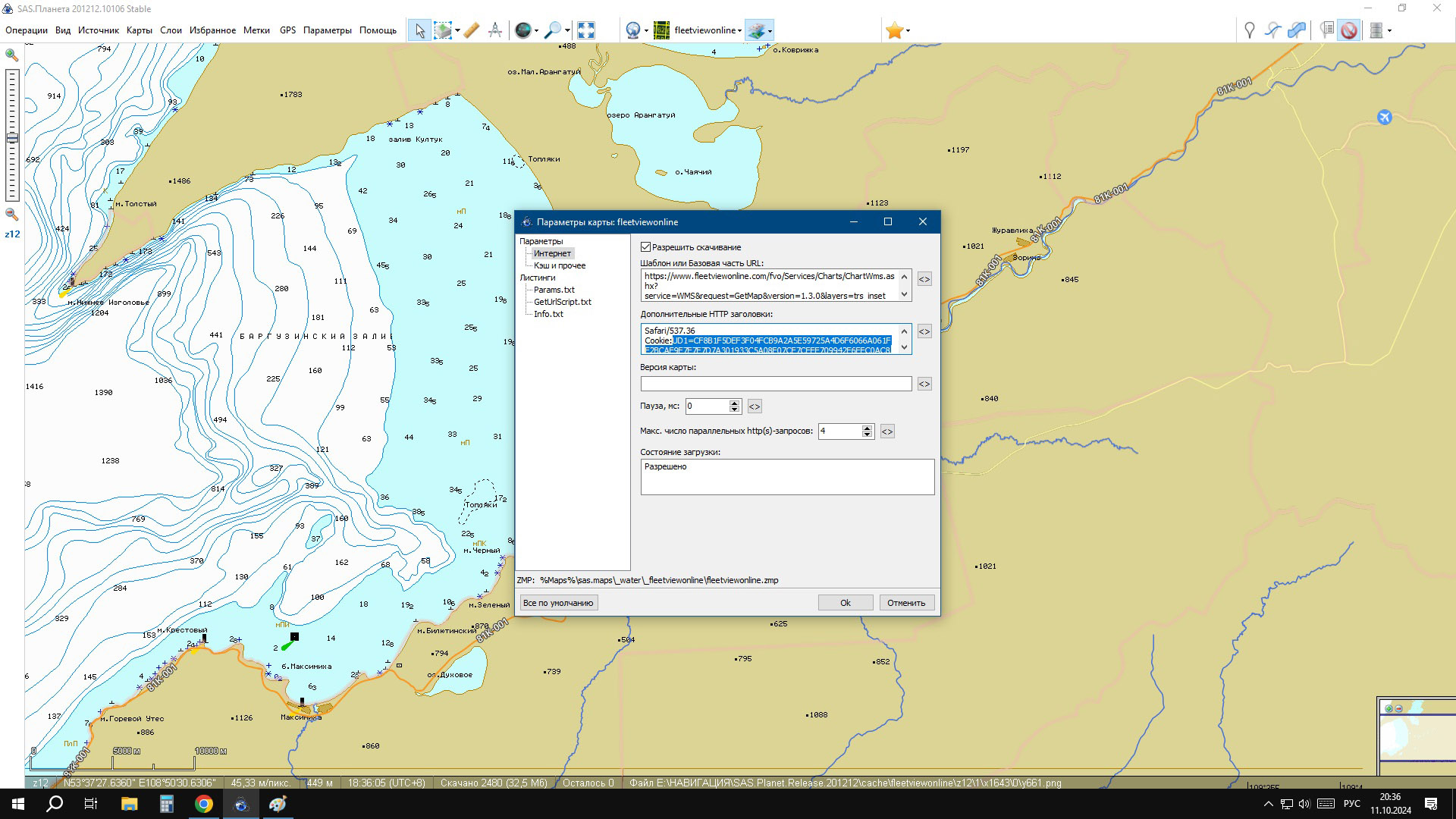 5. В SAS.Planet Заходим в "Параметры - Параметры карты - Интернет" и в окне "Дополнительные HTTP заголовки" прокручиваем в конец списка хидеров до "Cookie:", куда и подставляем скопированный текст куки, и жмем ОК -