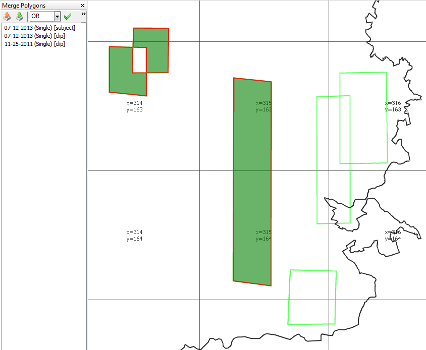 4. Если применяется логическое ИЛИ, то при любом количестве выбранных полигонов и независимо от того, накладываются они друг на друга или нет, покрытие должно охватывать все полигоны без исключения. Но получается это не всегда.