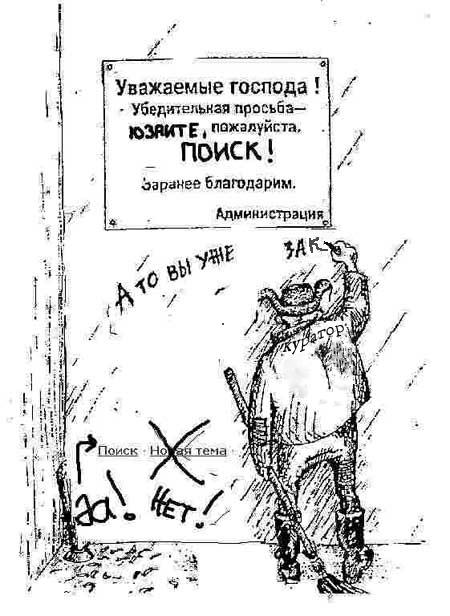 2.6.1 Новые темы, сообщения и вопросы с ключевым смыслом "У меня сейчас нет времени читать всё - поэтому ответьте-ка мне ЕЩЕ раз, персонально и прямо сейчас!" - будут расцениваться Администрацией как неуважение к личному времени всех собравшихся и удаляться\закрываться без предупреждения.
