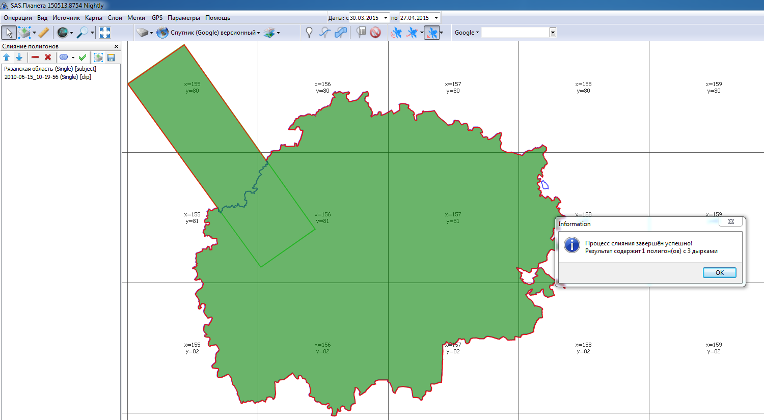 Впрочем, раз определение дырки чёткое, дырка обязана обнаруживаться визуально. Мне стало интересно, увеличил картинку и стал рассматривать места пересечения полигонов. Да, из-за весьма причудливой формы границы Рязанской области прямоугольник пересекает эту границу трижды в обоих случаях, вот откуда две дырки. Но есть ещё одна. И она образуется не при слиянии полигонов. Я пробовал слить границу области с простым четырёхугольником, явно пересекающем её в двух точках, там не может образоваться дырка. Но одна всё равно получалась. Поскольку полигон нельзя слить с самим собой, пришлось тупо обходить границу в поисках. И я её нашёл. Так что всё правильно с дырками.