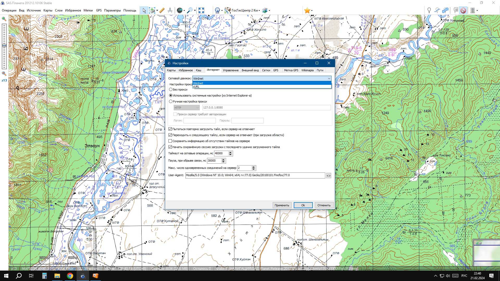 Сетевой движок WinInet устанавливается в Параметры - Настройки - Интернет, после чего перезапустить прогу. Потому как по умолчанию "из коробки" стоит движок "cURL".