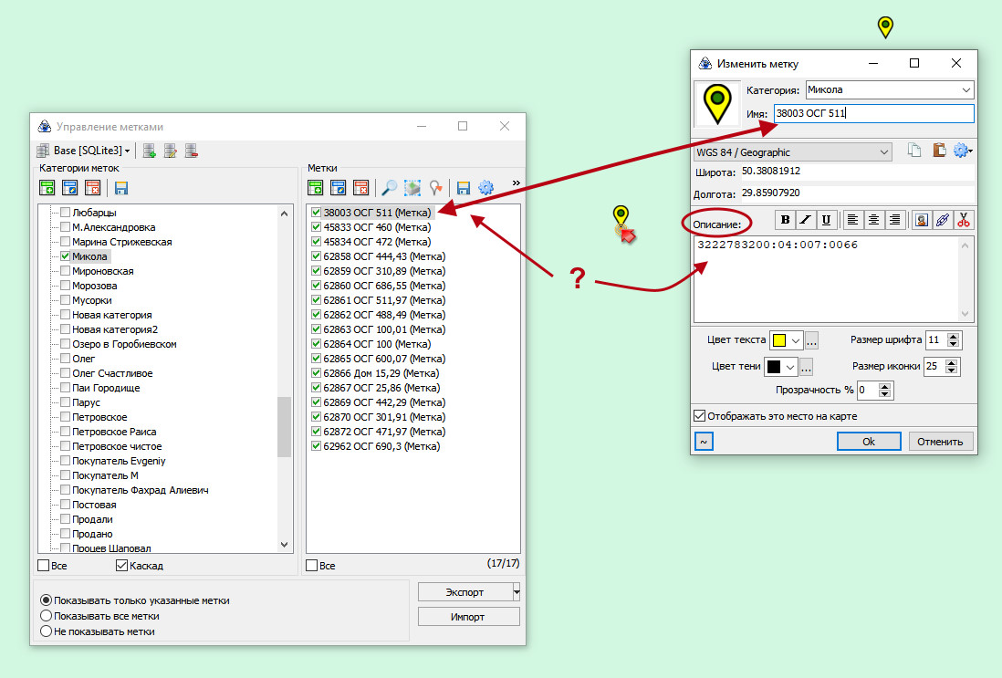 С ПКМ все понятно. Но, вопрос у меня был совершенно в другом - как отобразить описание в списке... Ну, ладно. Решил по другому. Изменил алгоритм формирования импортируемого KML-файла. Теперь у меня в одной строке имя и описание метки... Также поступаю при ручном добавлении метки - просто в "Имя" забиваю всю информацию. Немного не правильно, но, получил то, что хотел. Жаль, что Гуру проигнорировали мой вопрос. Мне кажется, что в каком-то ini-файле можно было внести изменения, после чего в списке меток будет отображаться имя + описание.