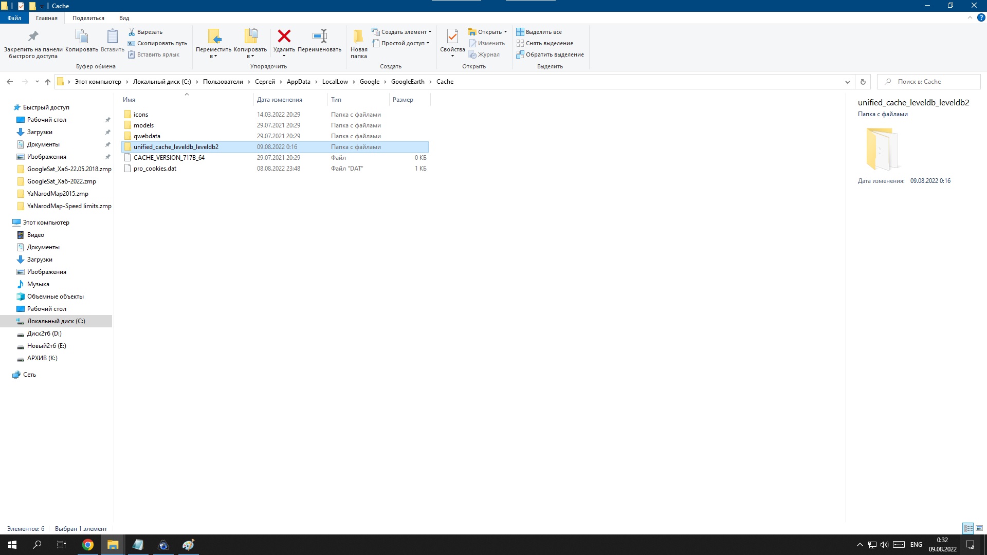 2. Затем на системном диске найдите путь к кэшу GoogleEarth - это будет что-то типа С:\Users\username\AppData\LocalLow\Google\GoogleEarth\Cache\