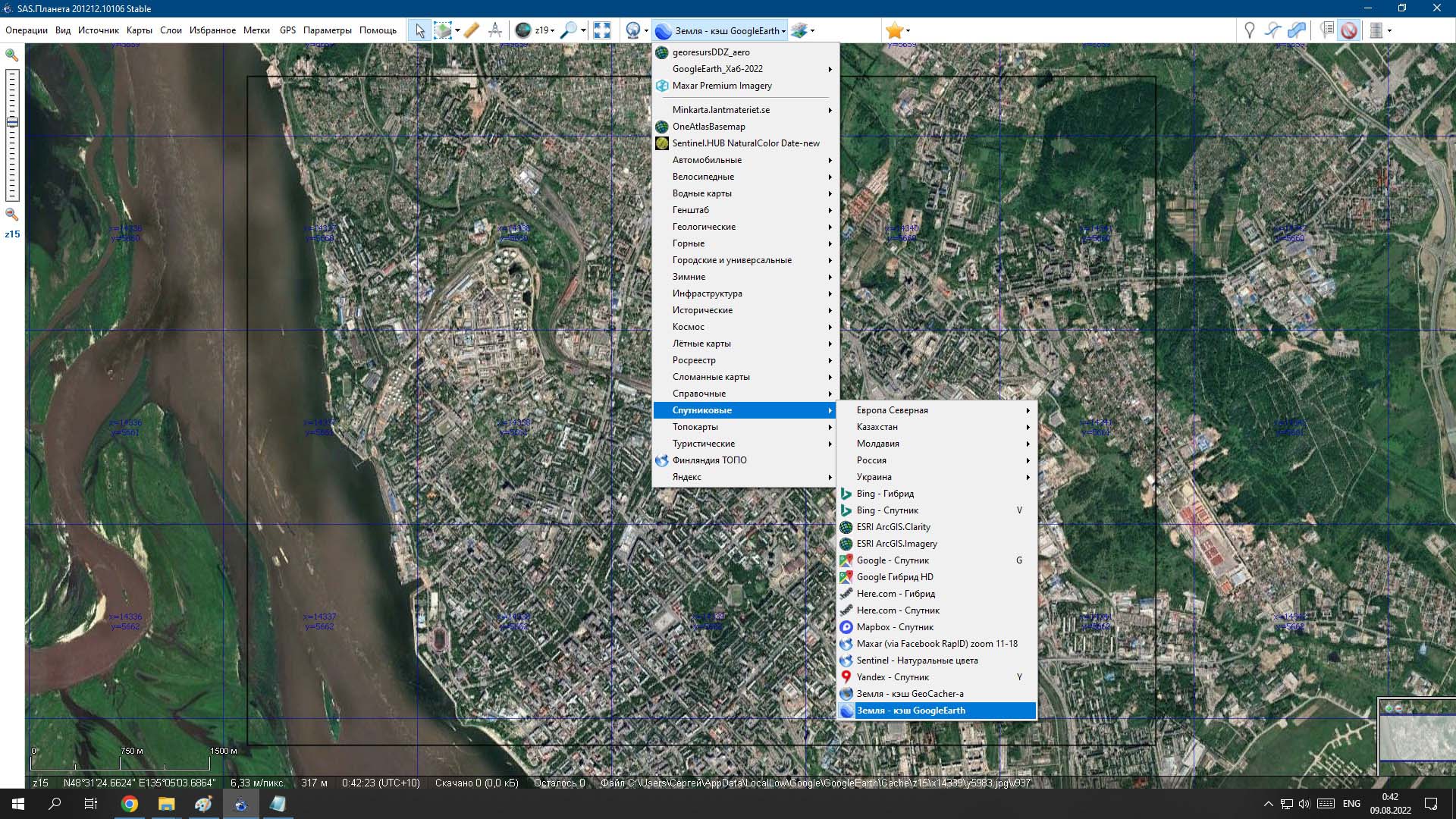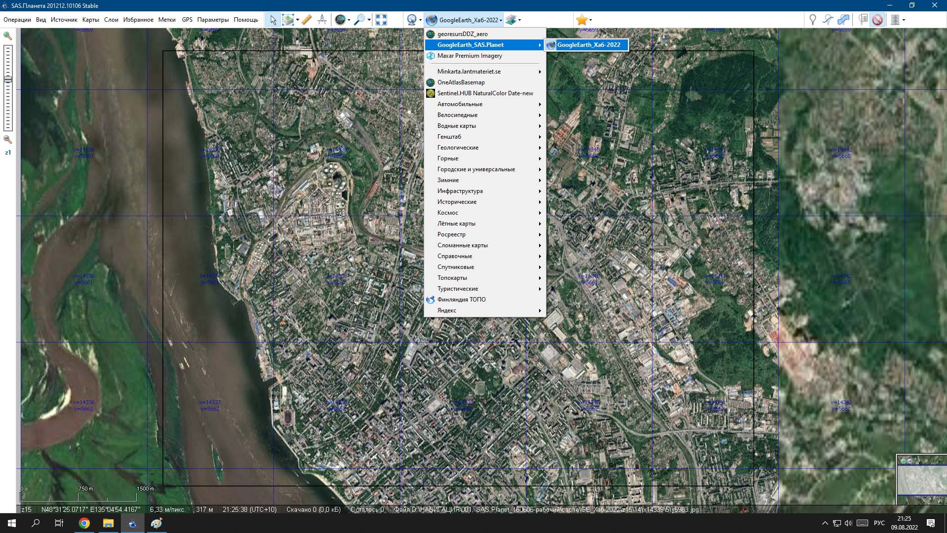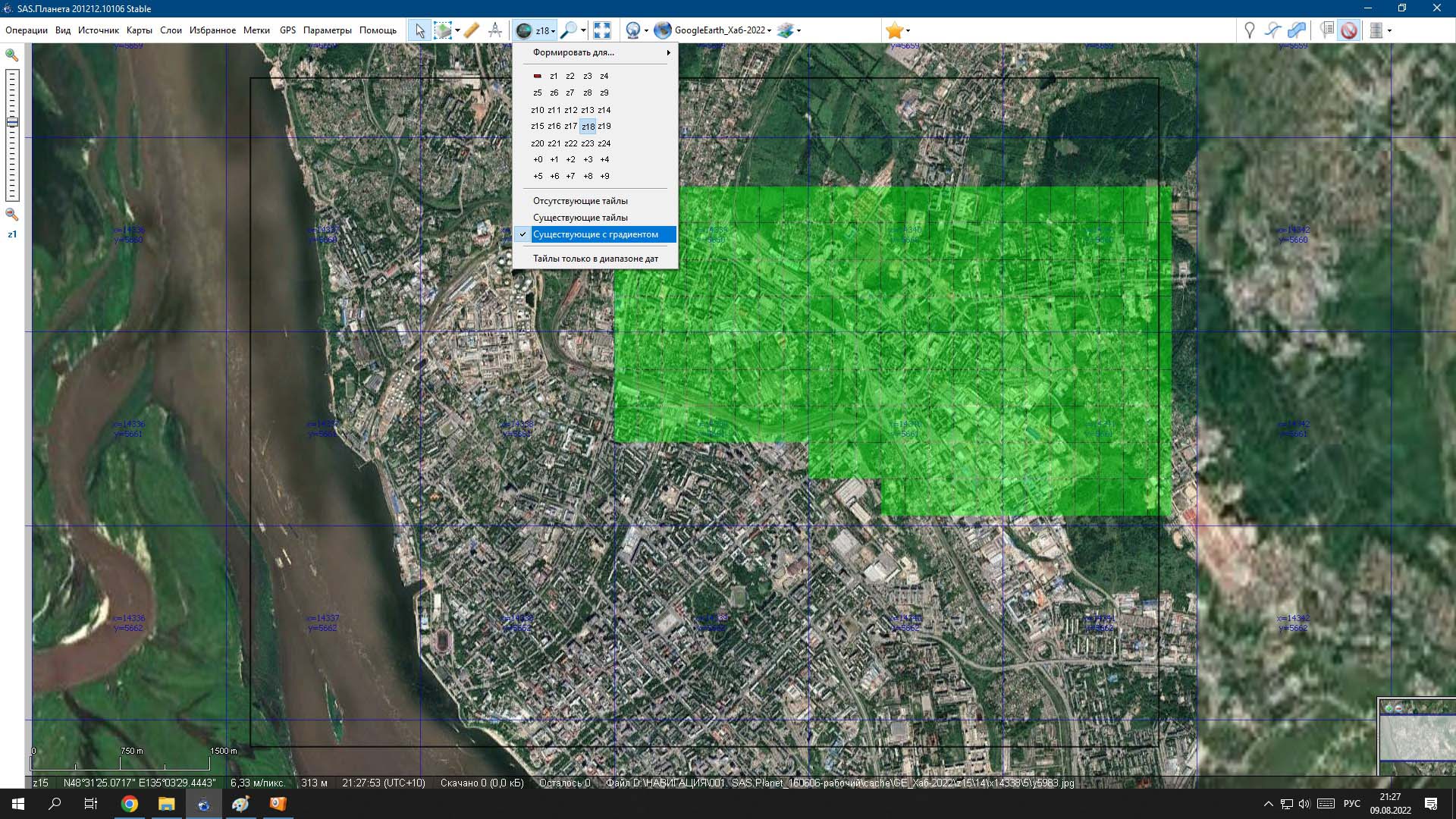 10. Проверяем заполнение тайлами, если оказались пропуски - придется закрыть SAS.Planet, запустить GoogleEarth и опять поползать в этих местах. Затем повторить пункты 8, 9, 10.. Скрин: