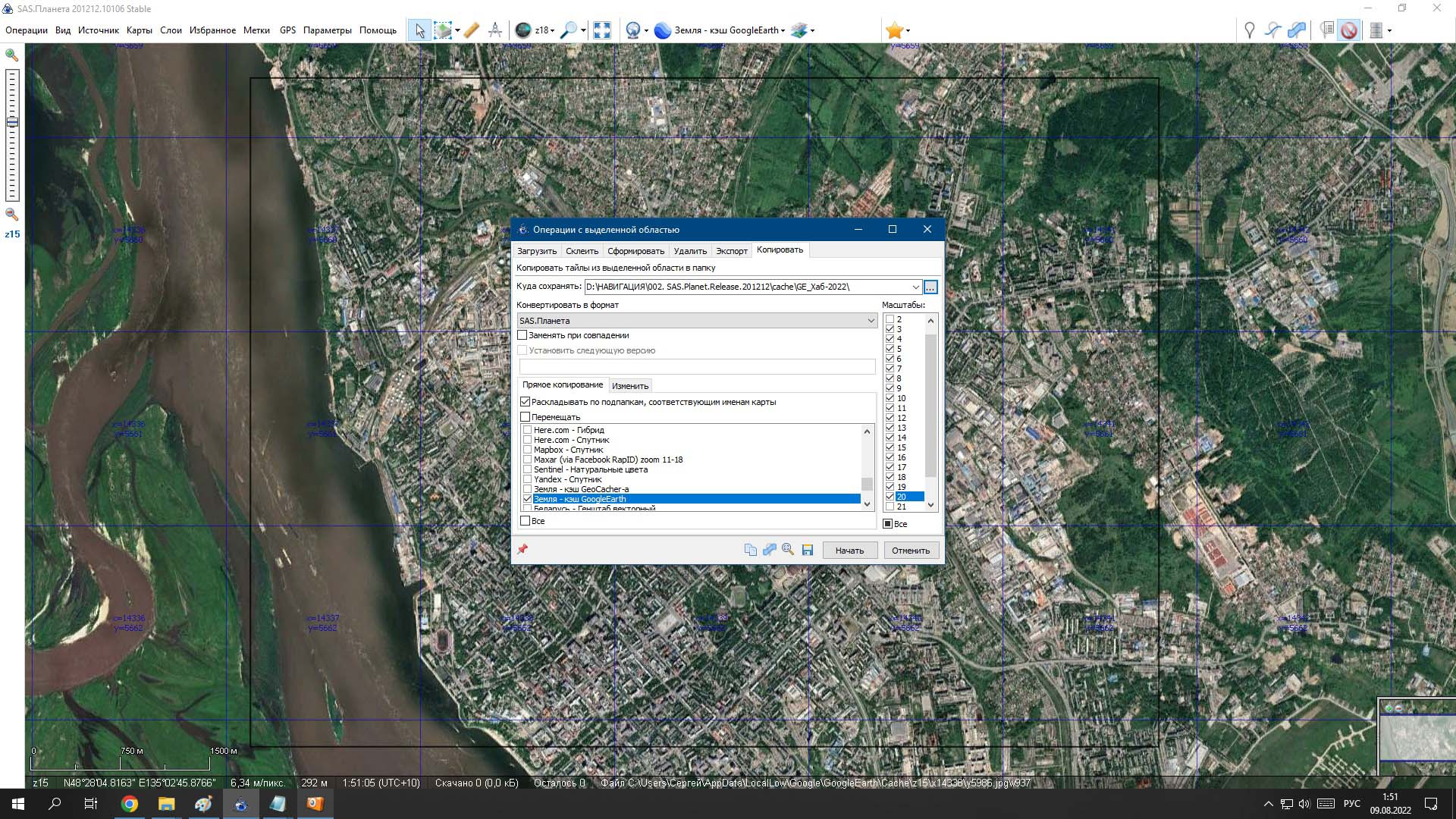 - прописываем "Куда сохранять", лучше указать папку "GE_Хаб-2022" через" три точки", "Конвертировать в формат" - выбираем SAS.Планета, ставим галки в чекбоксы нужных масштабов, и жмем "Начать"...
