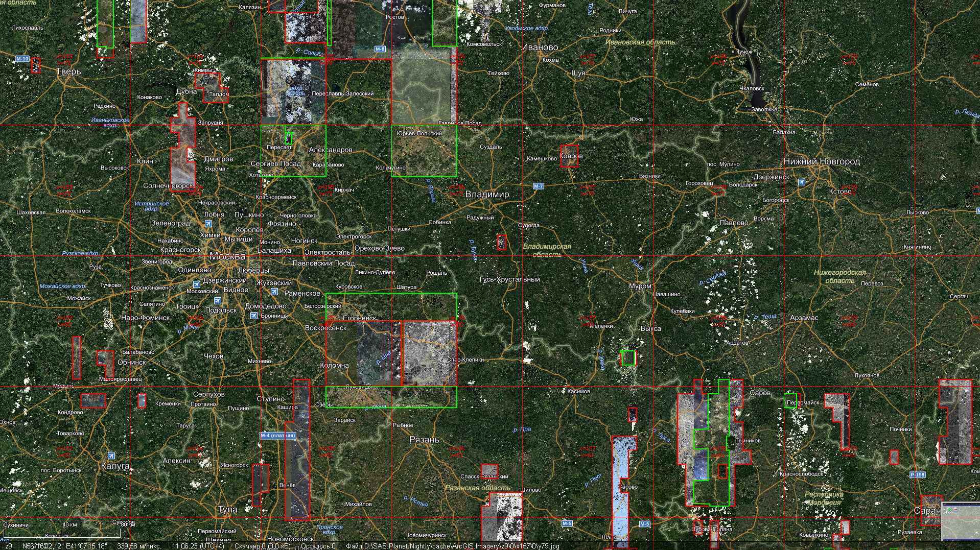 Красные контуры - Подробные снимки имеются, но не были перекрашены и встроены в глобальное покрытие. Прямоугольные границы говорят о том, что материал для работы в этих местах имеется. Ждем.