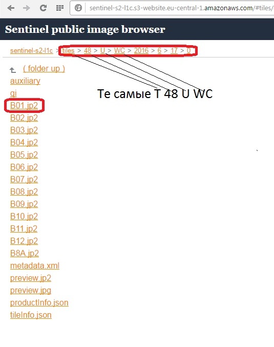 3) Дергаем все файлы B01.jp2 с репозитория соответствующего снимка. Берем этот файл, т.к. он легче остальных и обработать его проще. Допустим мне нужен тайл T48UWC. Обращаемся к репозиторию и находим нужный тайл и искомый B01.jp2.