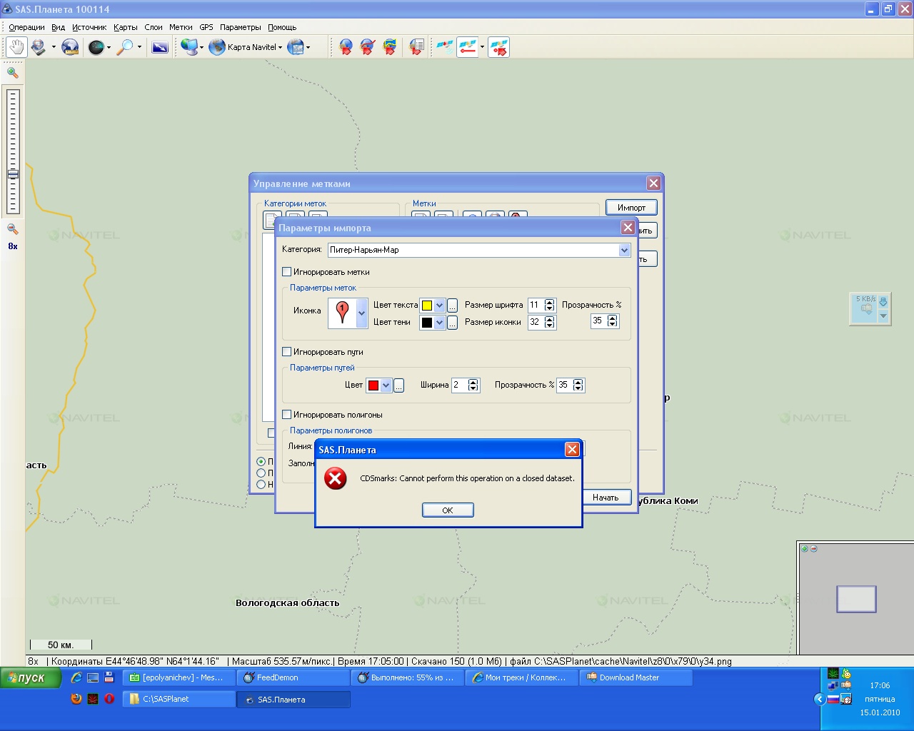 Сегодня скачал новую версию. С радостью обнаружил карту навител в ней. Тут же попробывал на нее наложить трек(сконвертиованный сайтом gpslib.ru в формат kml) и у меня вышла такая ошибка и программа зависла. Кто подскажет что это ошибка означает?Кто нибудь пробывал на карту навитела в сас планету накладывать треки?