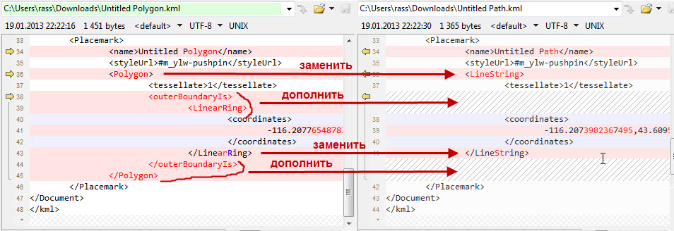 А можно и не ручками. Во вложении маленькая программа, которая все kml лежащие в папке d:\temp из треков превращает в полигоны