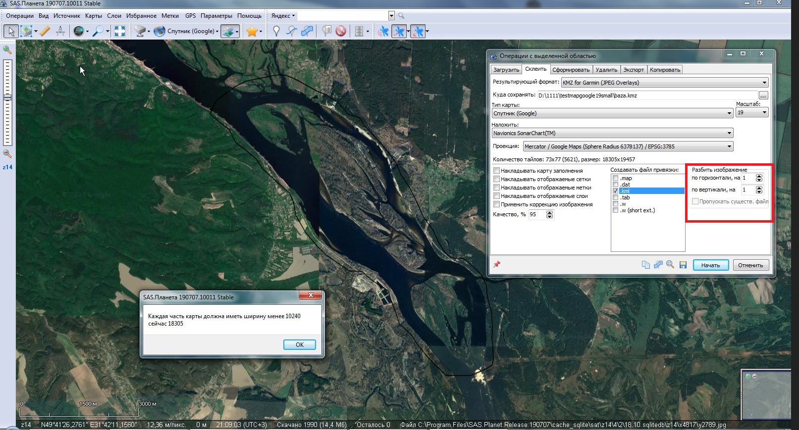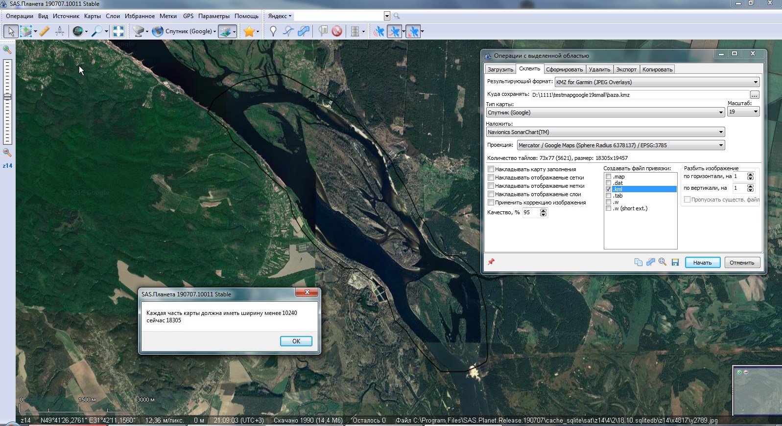 В SAS скачал нужный участок в виде Яндекс Спутника и Navionics Marine Charts в масштабах 18, 20, кажется еще 21. После этого "Склеил" тот же участок (по отдельности каждую карту естественно в свои отдельные папки) в GeoTIFF при масштабе то ли 20 то ли 21, проекция Проекция карты Mercator ... , с применением коррекции изображения, формат BigTIFF, сжатие None, и со всеми файлами привязки.
