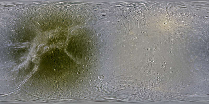 Эта карта мира в цилиндрической проекции — одна из шести новых цветных карт средних ледяных спутников Сатурна. Она была построена с помощью фотографий, сделанных космическим аппаратом Кассини в течение 10 лет.