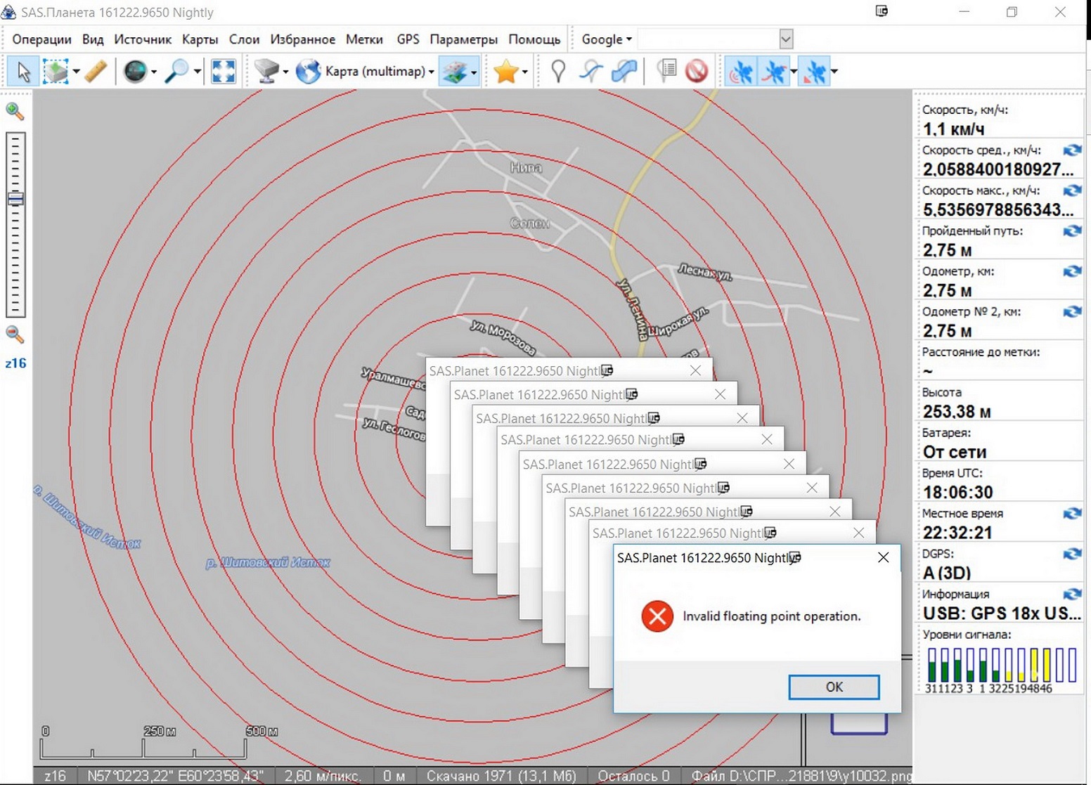 Добрый день. Вышеуказанная ошибка стала проявляться периодически в 160707 с конца лета. Алгоритма появления заметить не могу. Сначала пенял на Кэш, поставил ночную последнюю версию и через 5-7 мин. то же самое. В скриншоте как раз изображение ночной версии. Странностей больше не заметил кроме показаний скорости с десятизначными числами. И не сохраняются настройки какие датчики должны быть на экране. САСПланет у меня используется на Windows 10 х64. Данная ошибка устраняется только через Диспетчер задач путем снятия задачи. Спутниковый приемник (Garmin-USB) работает вроде стабильно, бывают потери на доли секунды, но на ошибку не влияют.
