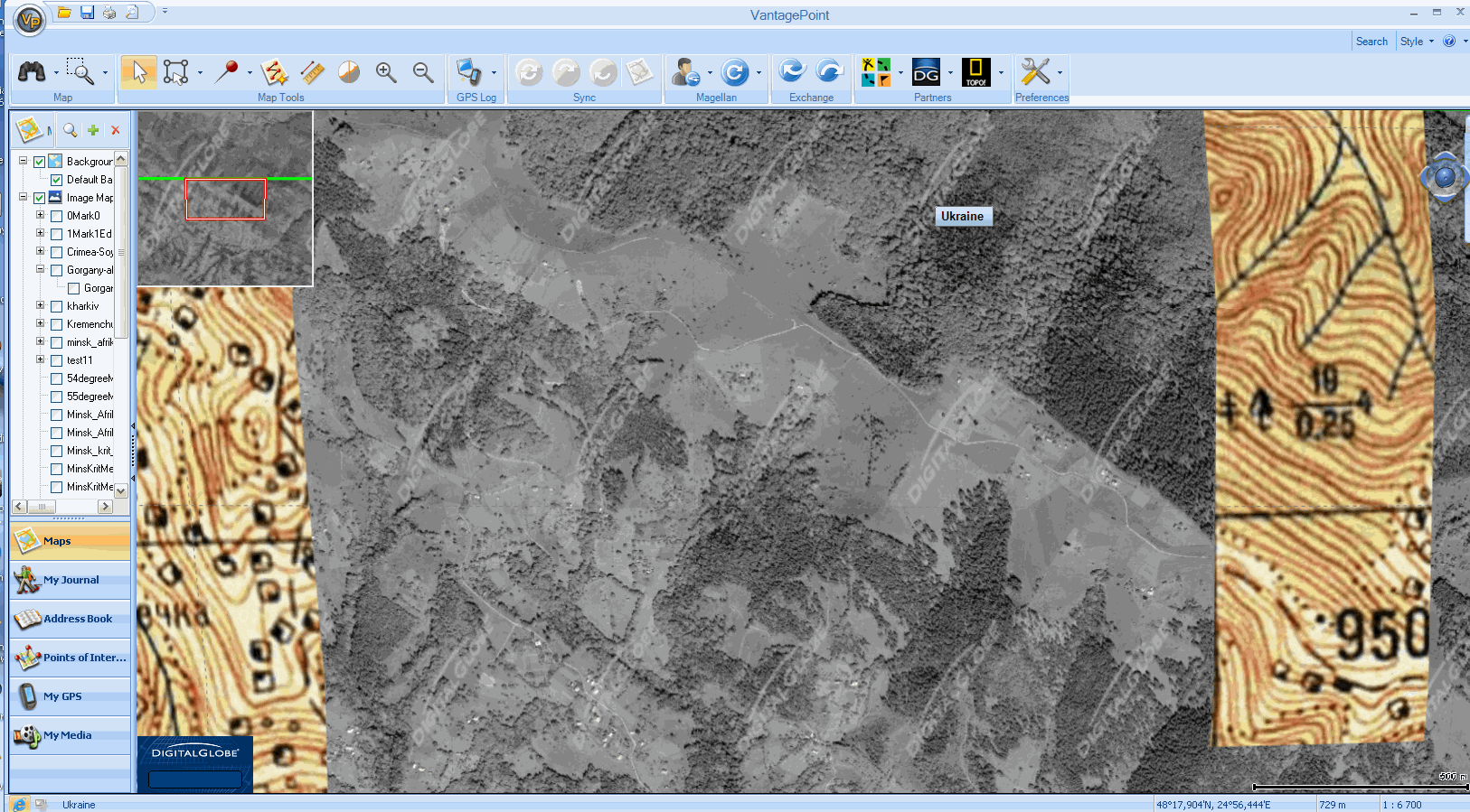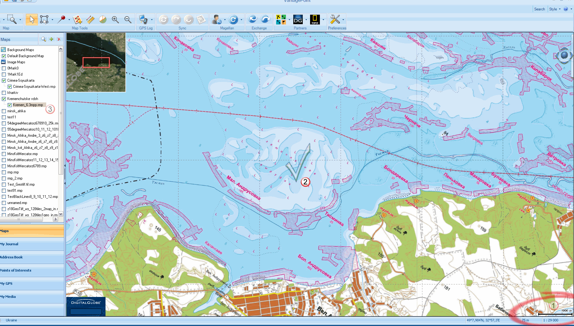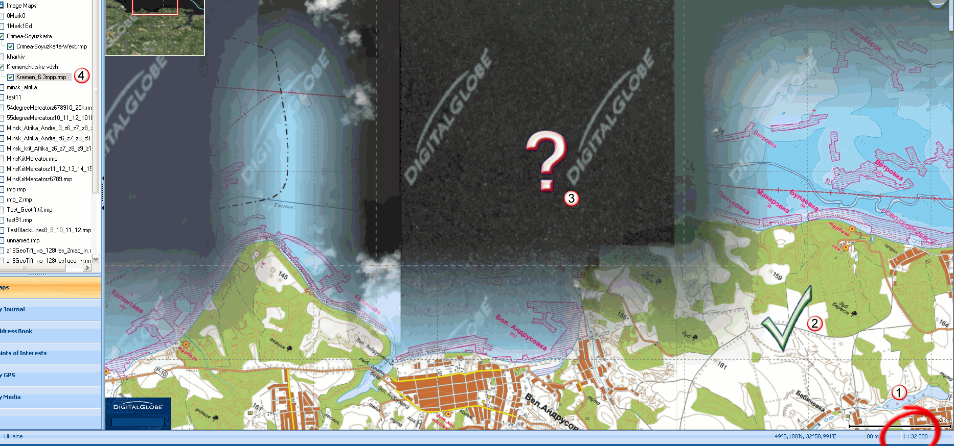 Но мои предположения разбились о суровую реальность! Я загрузил точно те же карты, что и в ваших примерах (крымскую Союзкарту, Горганы и Кременчугское водохранилище) и включил отображение спутниковых снимков от Digital Globe.