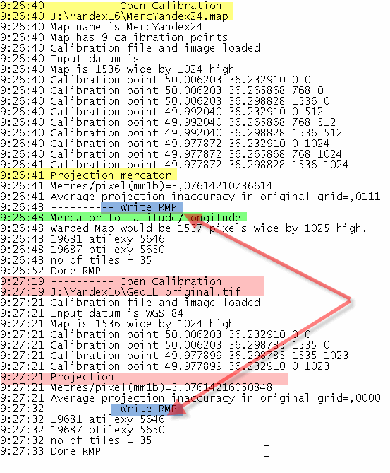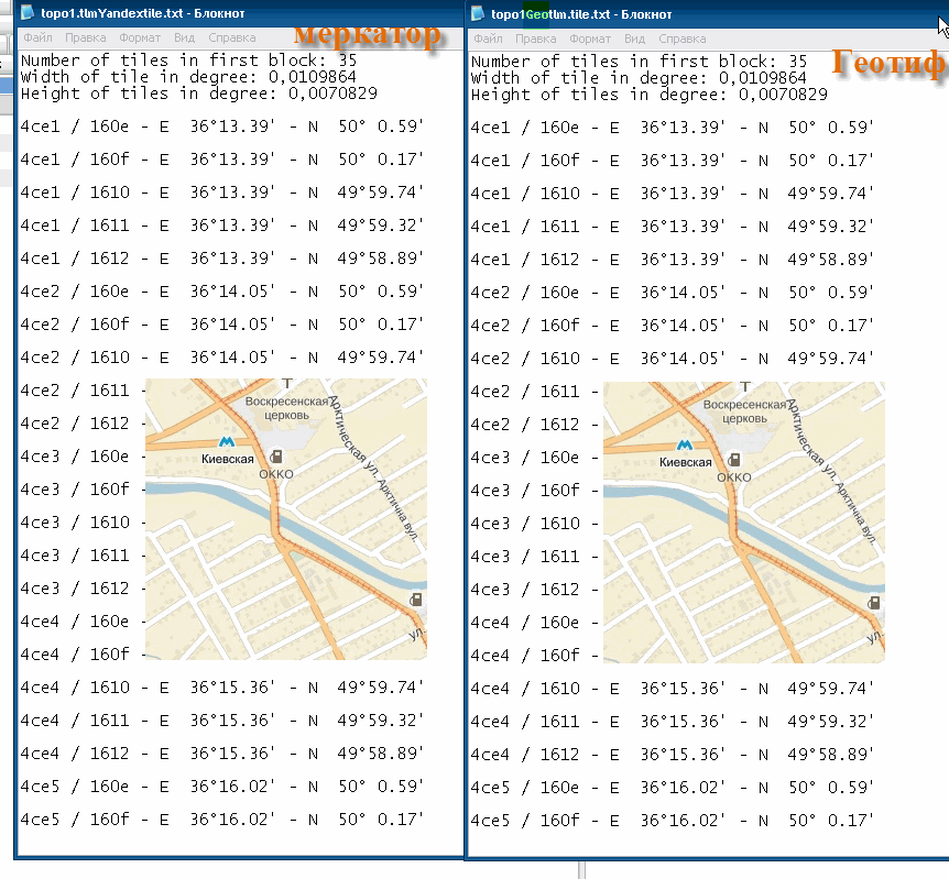 и если взять меркатор EPSG 3395 (Яндекс карты) то тайлы и из GeoTiff LL и из Меркатор (.map) идут 1 к 1_му по рисунку и по координатам.