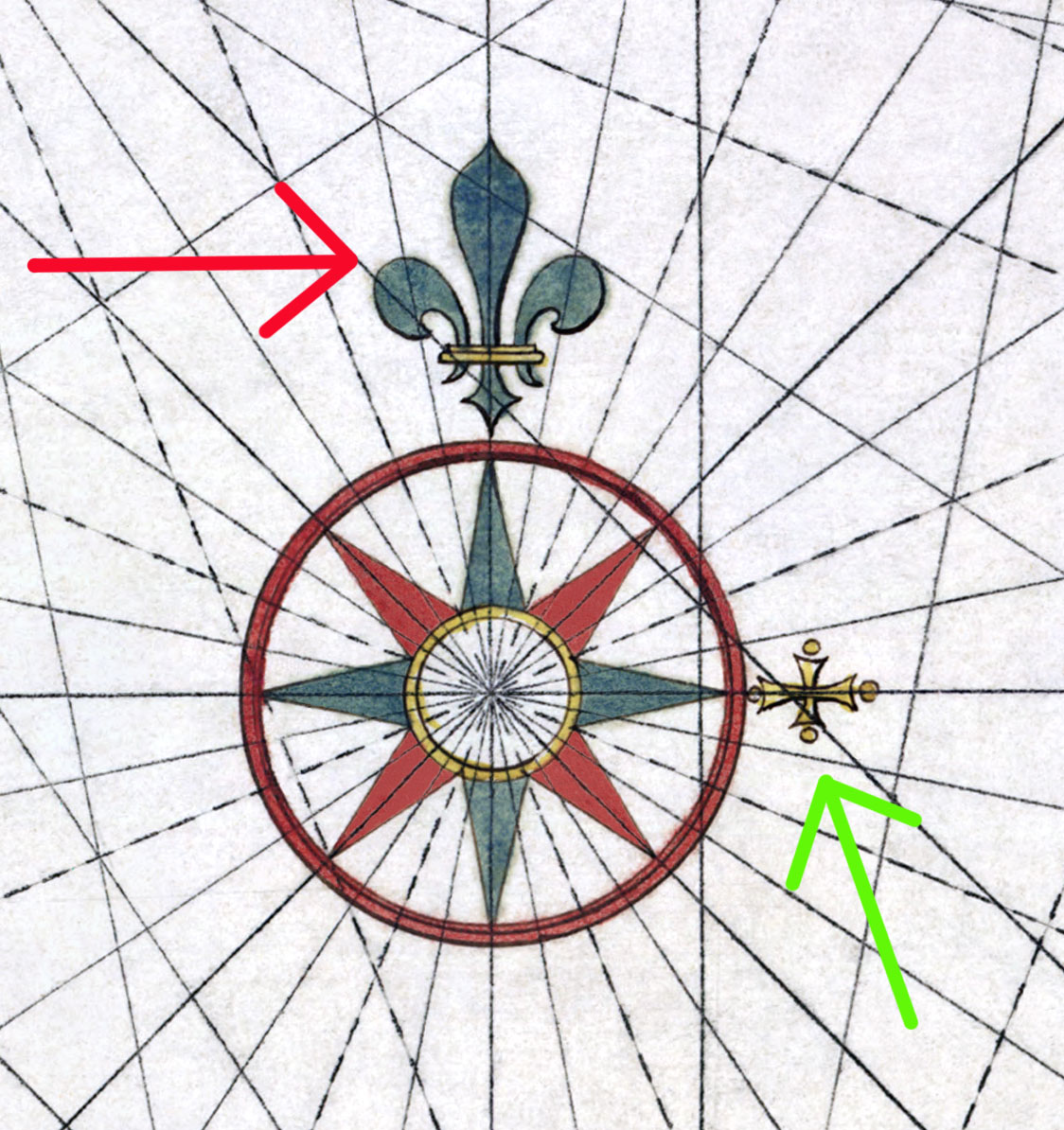 И еще: выше я приложил довольно-таки поздние карты, у них на полях уже есть вменяемые градусы - и соответственно привязать их уже дело техники и движений мышкой. Но у ранних карт такой роскоши еще не было, градусов тогда еще не разумели - а карты уже были. И розы на них - тоже были. И вот там вопрос стоит как "имея ТОЛЬКО карту - как узнать, что за местность на ней, и как их привязать?"